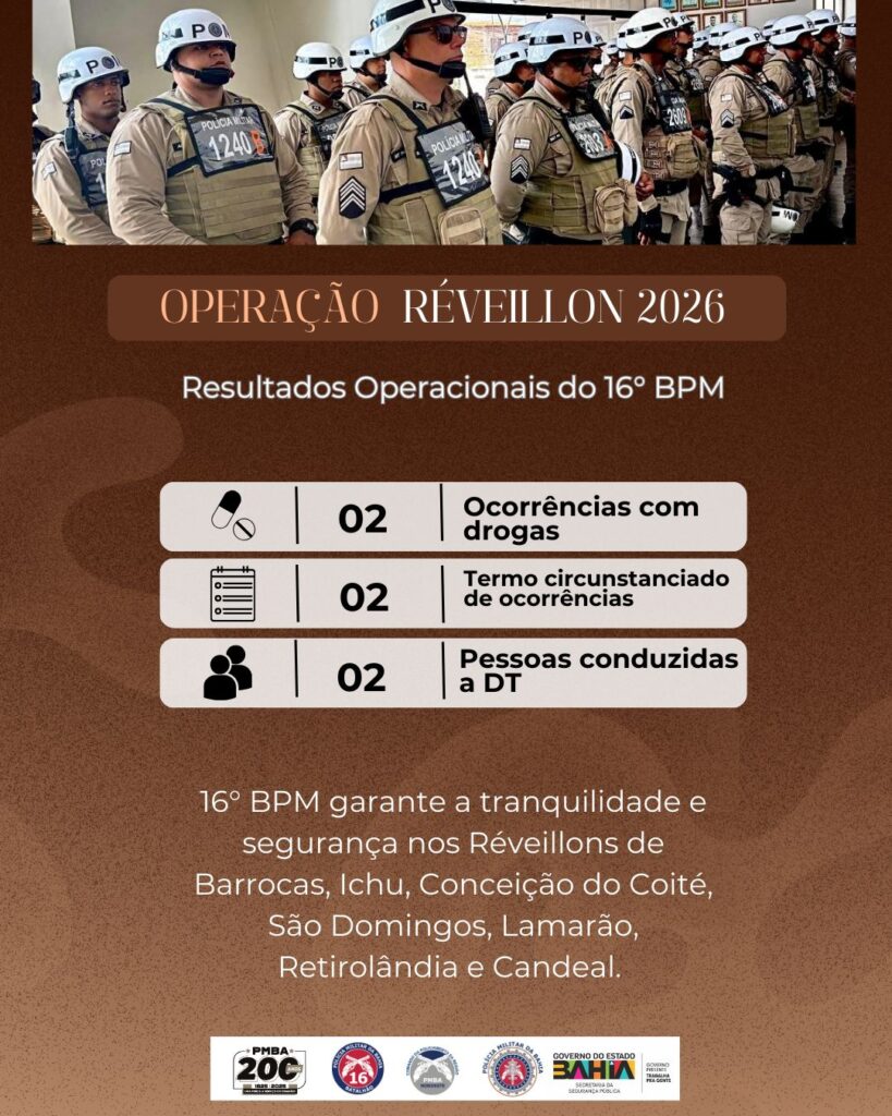 O 16º Batalhão de Polícia Militar realizou a Operação Réveillon no período de 30 de dezembro de 2025 a 01 de janeiro de 2026, com reforço do policiamento nas festividades dos municípios de Conceição do Coité, Retirolândia, São Domingos, Ichu, Barrocas, Lamarão e Candeal.