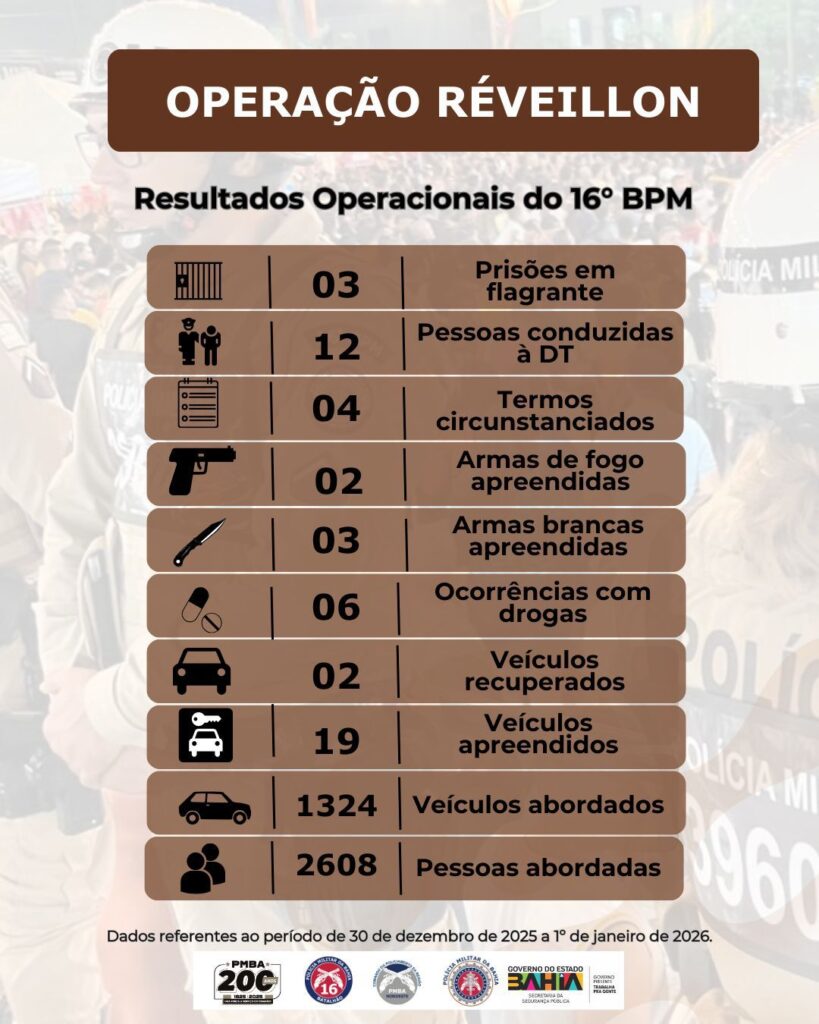 Os resultados refletem o compromisso do 16º BPM, por meio de ações planejadas e do empenho incansável da tropa, em assegurar a tranquilidade, a ordem e a segurança da população do Território do Sisal durante as celebrações da chegada do novo ano.