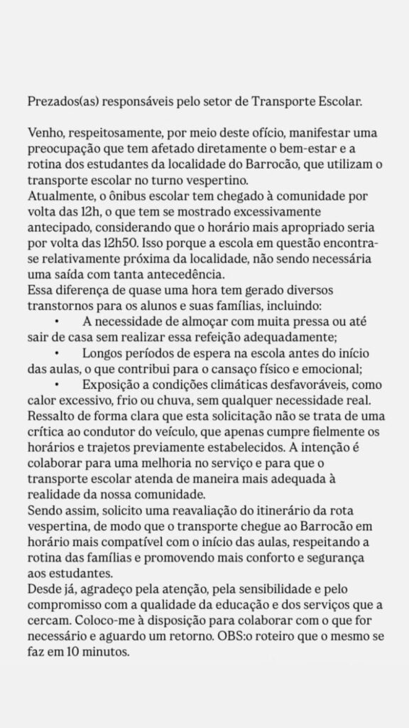 Pais e responsáveis pela comunidade do Barrocão solicitam sensibilidade da gestão para que o transporte escolar seja ajustado, respeitando a rotina e o bem-estar dos alunos. Eles aguardam uma resposta e se colocam à disposição para diálogo com o setor responsável, buscando garantir mais conforto e segurança para todos.