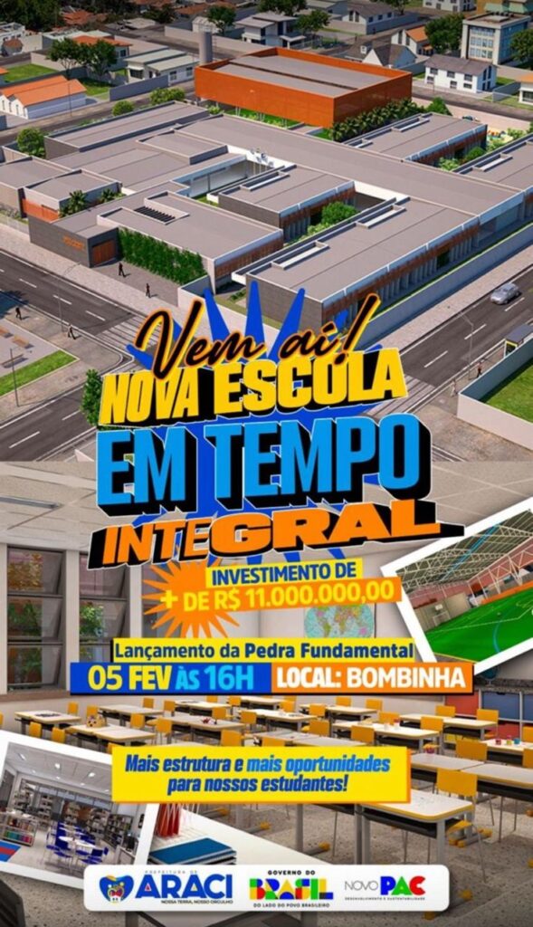 O município de Araci vive um novo e importante capítulo na área da educação. Na próxima quinta-feira, dia 5 de fevereiro, às 16h, será realizado o lançamento da pedra fundamental da nova Escola em Tempo Integral da cidade, em um evento que marca o início de um dos maiores investimentos educacionais da história da cidade. A solenidade acontecerá na localidade de Bombinha e é aberta à participação da comunidade.