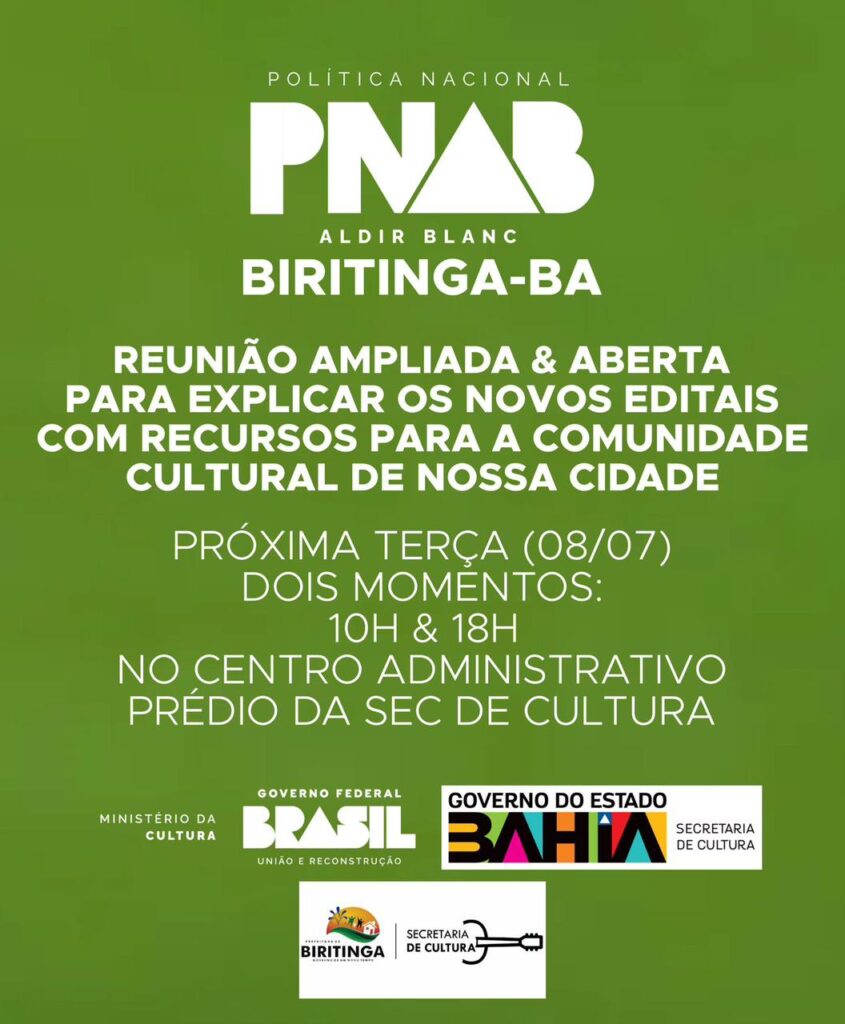 Na próxima terça-feira (8), o município de Biritinga irá sediar uma reunião ampliada e aberta com foco na Política Nacional Aldir Blanc (PNAB). O encontro tem como objetivo apresentar e explicar os novos editais que vão destinar recursos à comunidade cultural da cidade.