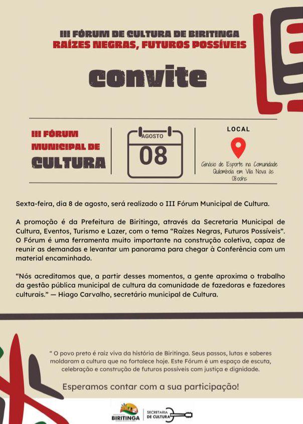 “O povo preto é raiz viva da história de Biritinga. Seus passos, lutas e saberes moldaram a cultura que nos fortalece hoje”, diz um dos trechos do convite oficial do fórum.