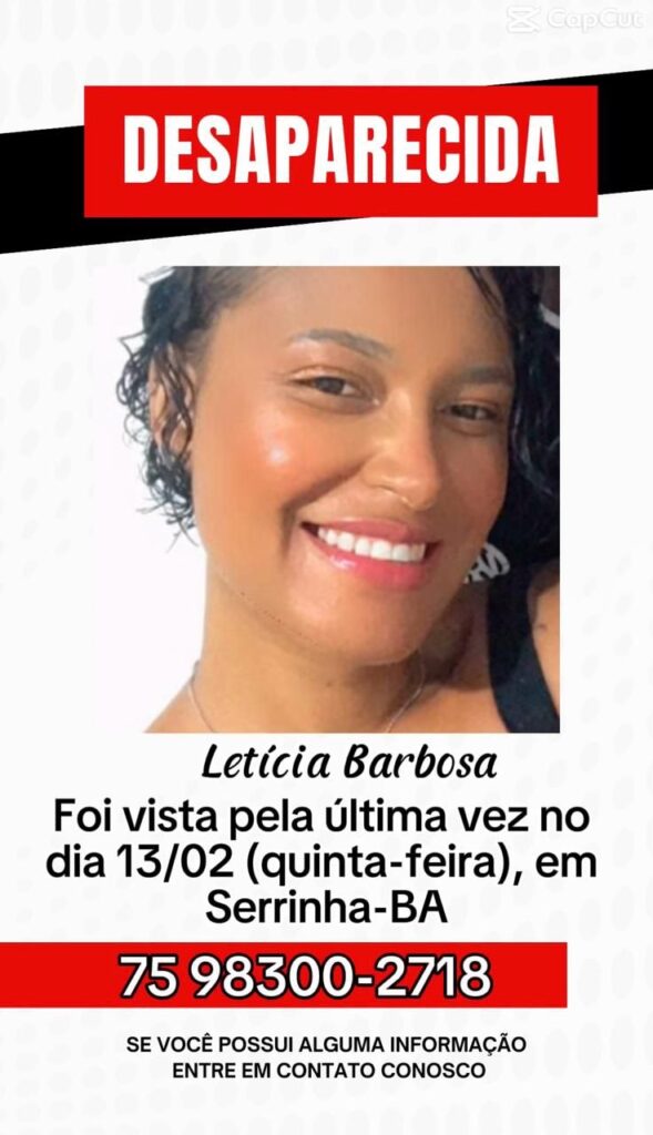 Letícia foi vista pela última vez na cidade de Serrinha-BA, que fica a cerca de 20km de distância de onde a jovem reside, e também pertence ao território sisal.