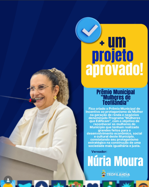 A Câmara Municipal de Teofilândia aprovou, durante a 8ª Sessão Ordinária realizada nesta semana, o projeto de lei que institui o Prêmio Municipal “Mulheres de Teofilândia”. A proposta é de autoria da vereadora Núria Moura, que também é presidente da Casa Legislativa, e integra o programa “Mulheres que Edificam”.