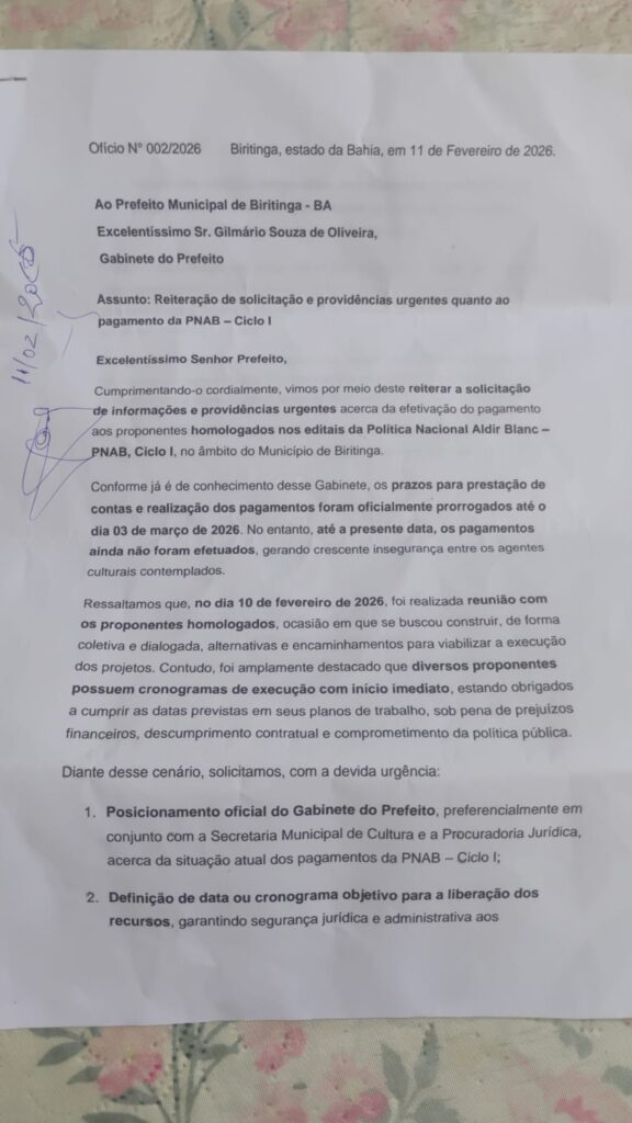 Um impasse envolvendo recursos públicos destinados à cultura tem gerado forte repercussão entre artistas e agentes culturais do município de Biritinga, na região sisaleira da Bahia. Documentos obtidos pelo Portal Massapê revelam uma série de ofícios encaminhados ao gabinete do prefeito denunciando a não execução de pagamentos previstos pela Política Nacional Aldir Blanc (PNAB), levantando suspeitas e acusações graves contra a gestão municipal.