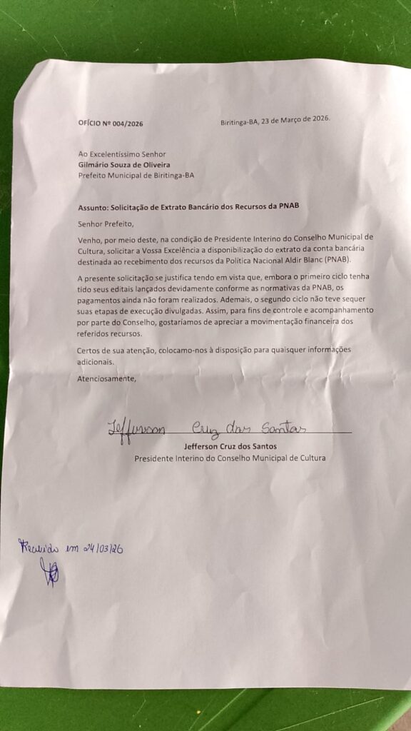 Já em um segundo ofício, datado de 23 de março de 2026, o tom se intensifica. O Conselho solicita acesso a gestão o extrato bancário da conta específica da PNAB no município, com o objetivo de acompanhar a movimentação financeira dos recursos públicos destinados à cultura.