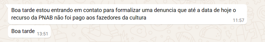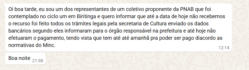 Outro ponto que agrava a denúncia diz respeito ao Ciclo 2 da PNAB. De acordo com os artistas, os recursos dessa nova etapa – que já foram depositados em 18/02/2026 – seriam utilizados para quitar os débitos pendentes com os contemplados do Ciclo 1. Em meio à pressão, o prefeito teria feito essa afirmação.