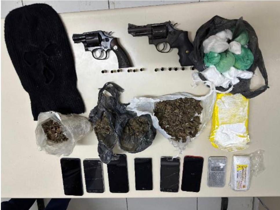Com os suspeitos, a polícia apreendeu dois revólveres calibre .38, um da marca Taurus e outro da Smith & Wesson, ambos com todas as munições deflagradas. Também foram encontrados uma balaclava, uma balança de precisão, 336 gramas de maconha e 1,5 quilo de cocaína, o que reforça a suspeita de que o local servia como base para o tráfico.
