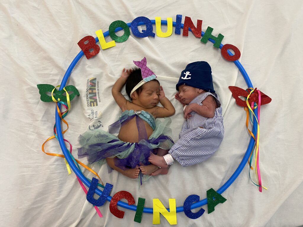 Já o Bloquinho da Prematuridade foi direcionado aos bebês prematuros assistidos na UCINCa e às suas famílias. A ação contou com ambientação e fantasias temáticas para os bebês e a participação da equipe multiprofissional, que organizou um ensaio simbólico de Carnaval, adaptado à realidade da unidade. A proposta foi integrar mães, pais e profissionais em um momento de estímulo ao vínculo e criação de memórias positivas, dentro da metodologia do cuidado canguru, que prioriza o contato e a participação ativa da família no processo de recuperação do recém-nascido.