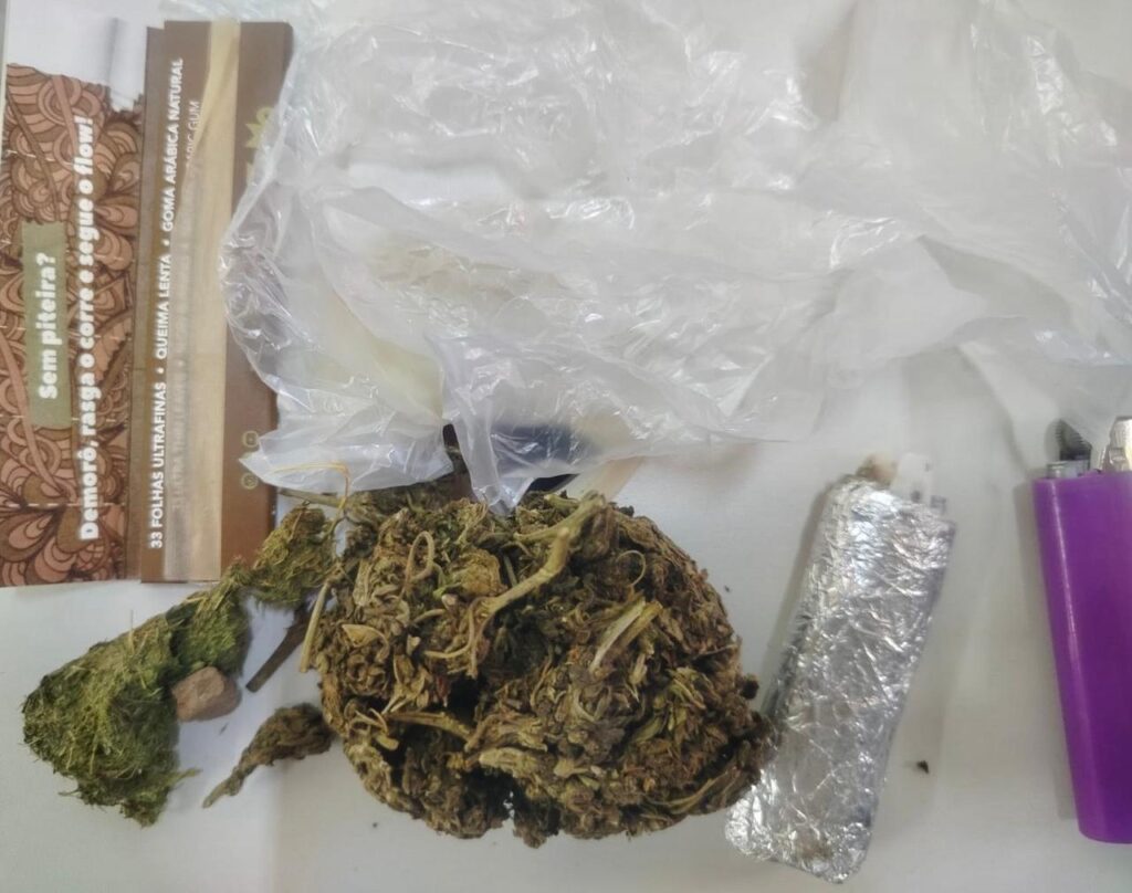No interior do imóvel, foram encontrados dez pássaros presos em gaiolas, além de dois tatus, sendo um abatido e outro ainda vivo, configurando infração à legislação ambiental. Durante a abordagem, os policiais localizaram também uma porção de substância análoga à maconha e um celular modelo iPhone 11 Pro Max, de cor dourada.