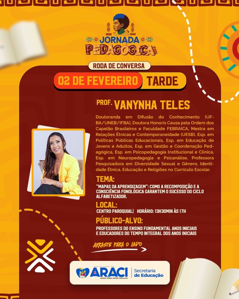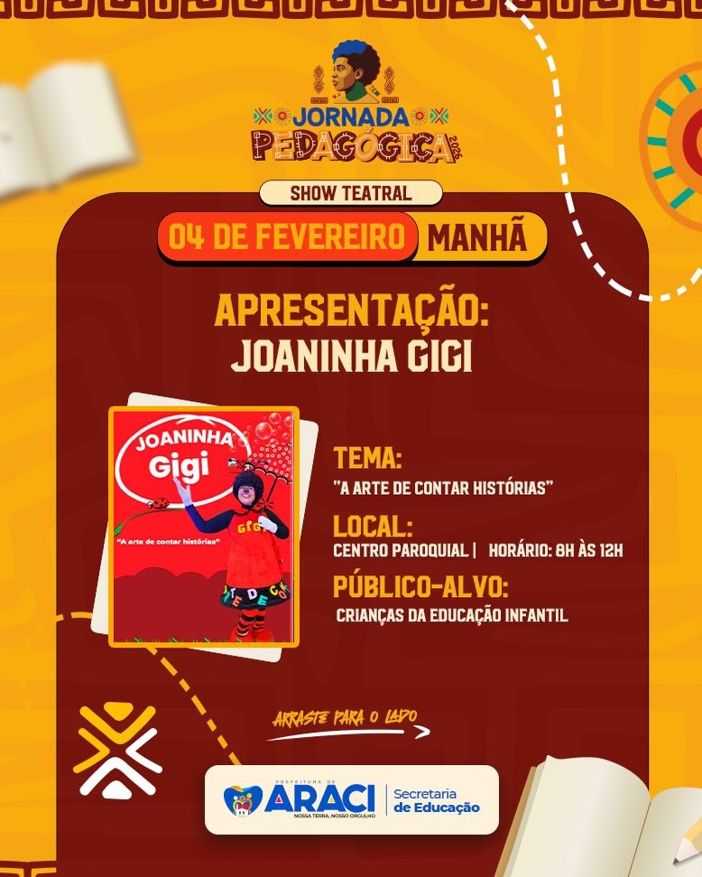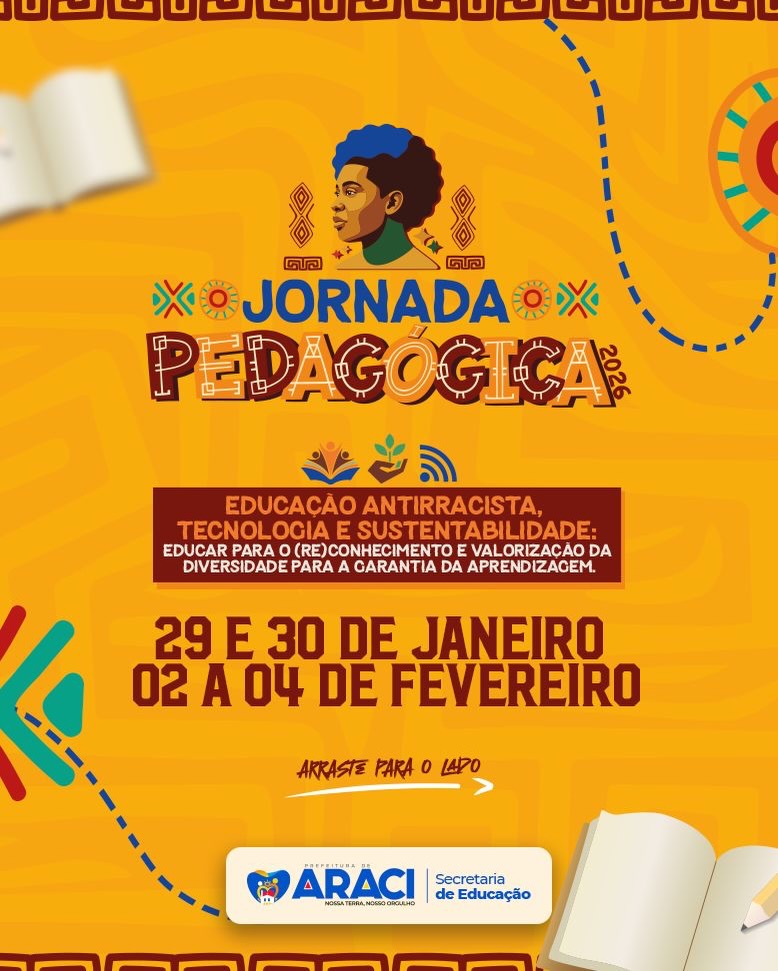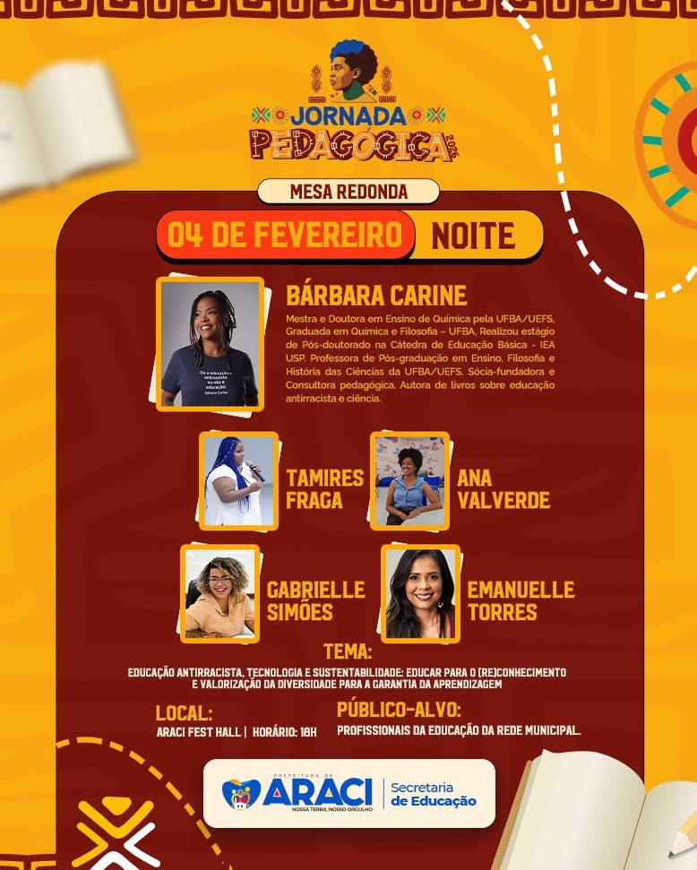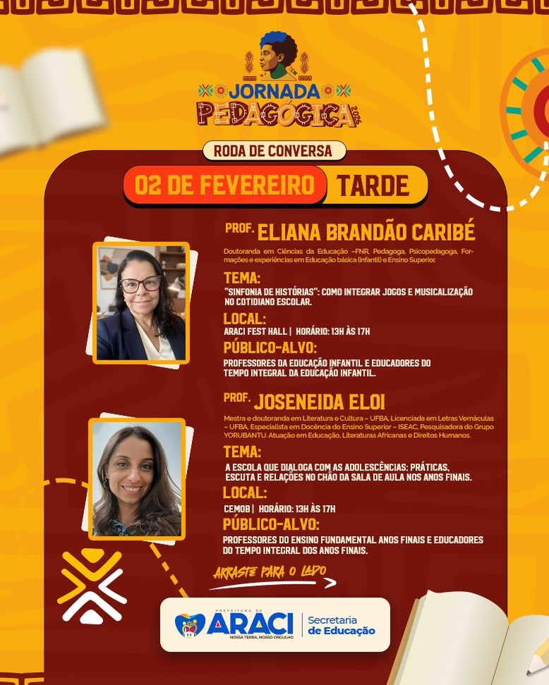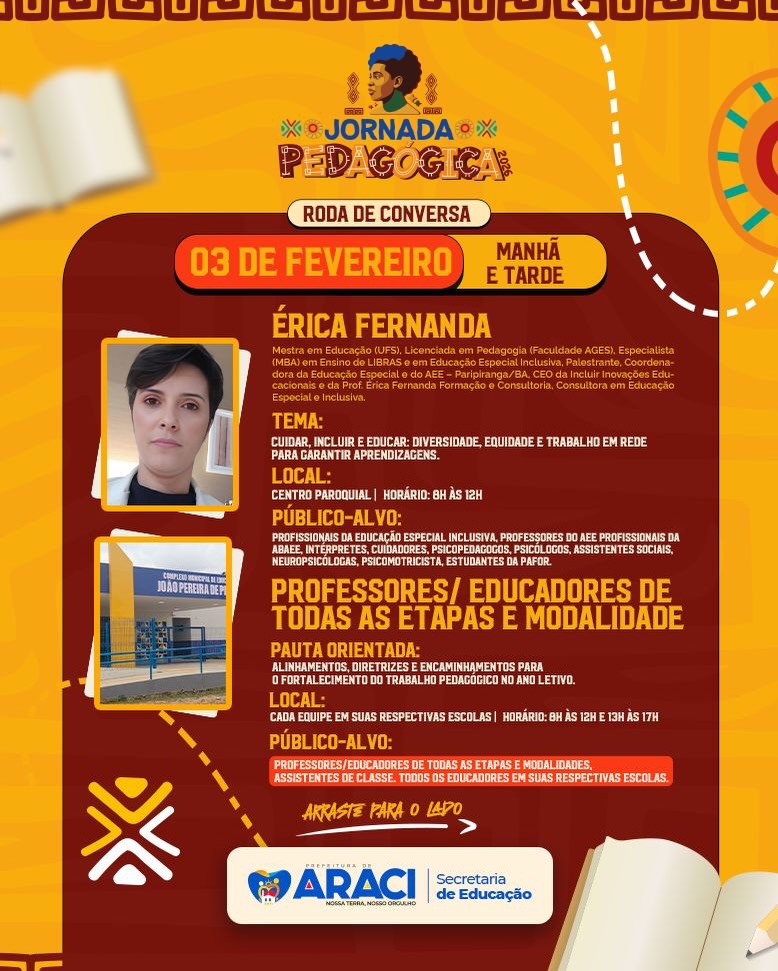 No dia 3 de fevereiro, as ações continuam com foco na educação inclusiva, busca ativa escolar e alinhamentos pedagógicos nas unidades de ensino. Já no dia 4 de fevereiro, a Jornada será encerrada com uma programação especial: pela manhã, as crianças da educação infantil participam do show teatral “A Arte de Contar Histórias”, com a personagem Joaninha Gigi; e, à noite, acontece uma mesa-redonda no Araci Fest Hall, com a participação da doutora Bárbara Carine e debatedoras convidadas, aprofundando o tema central da Jornada.