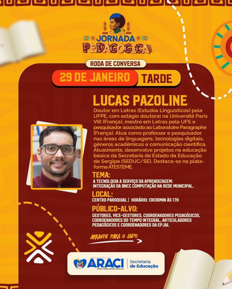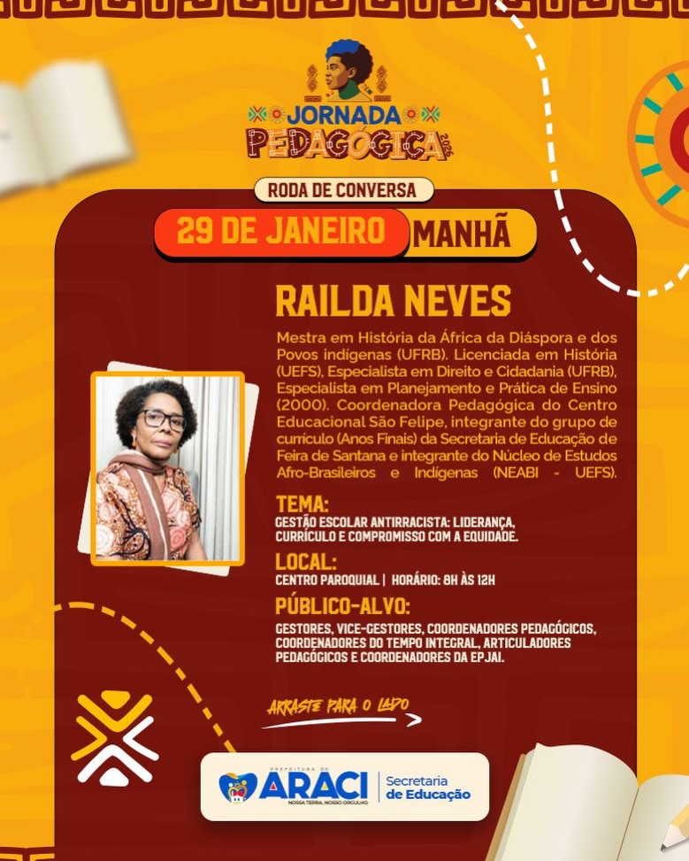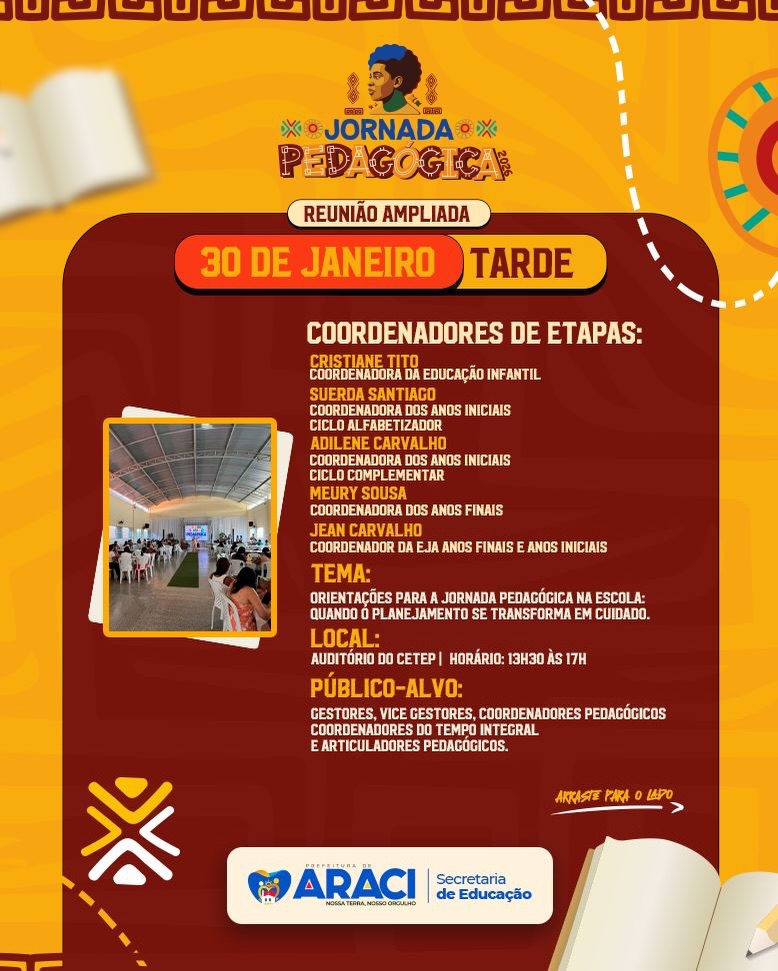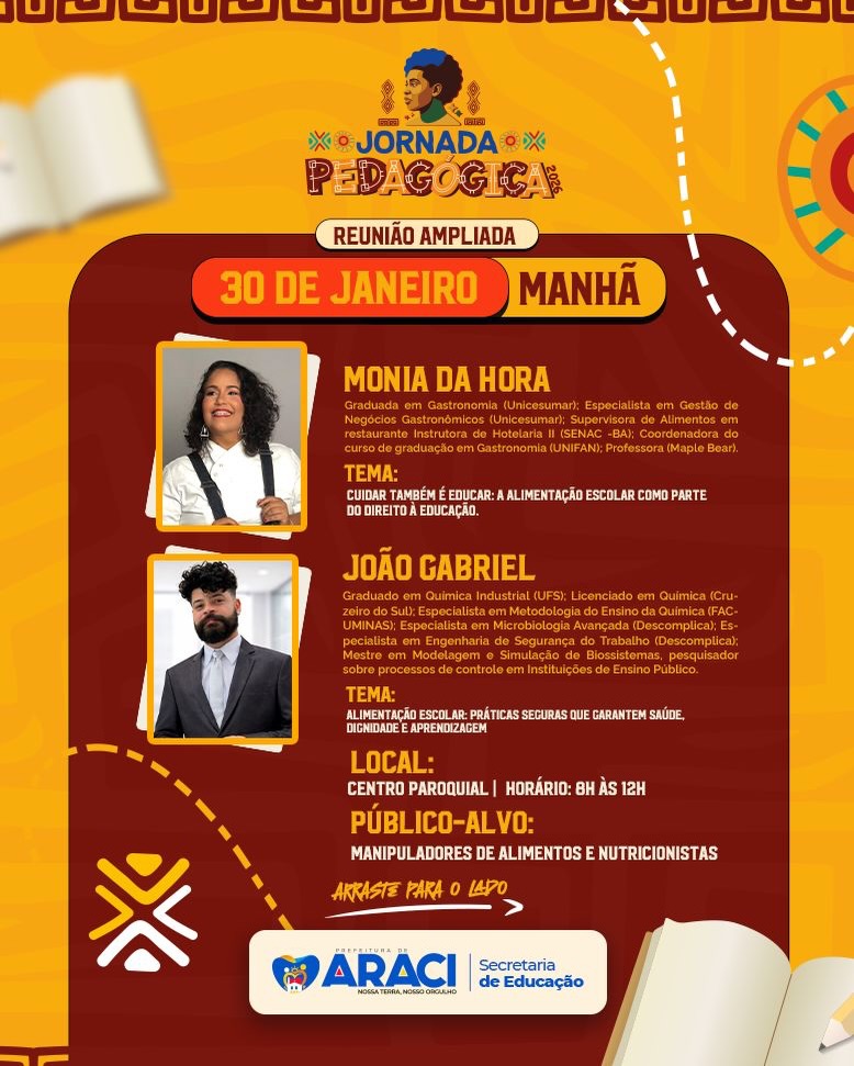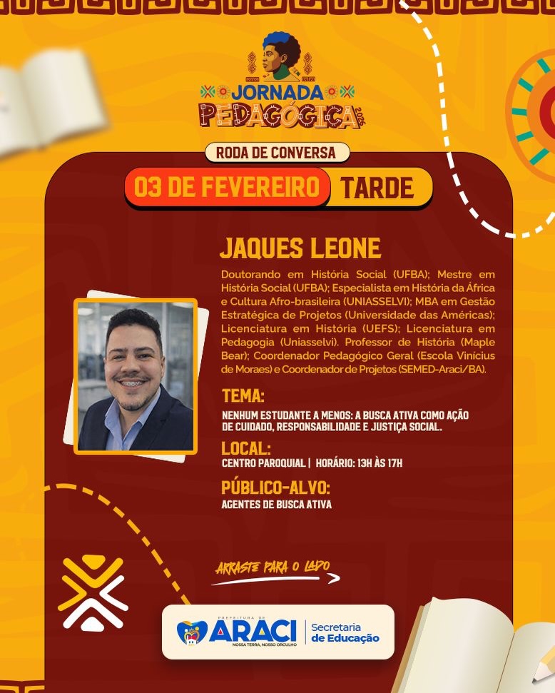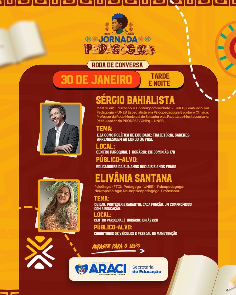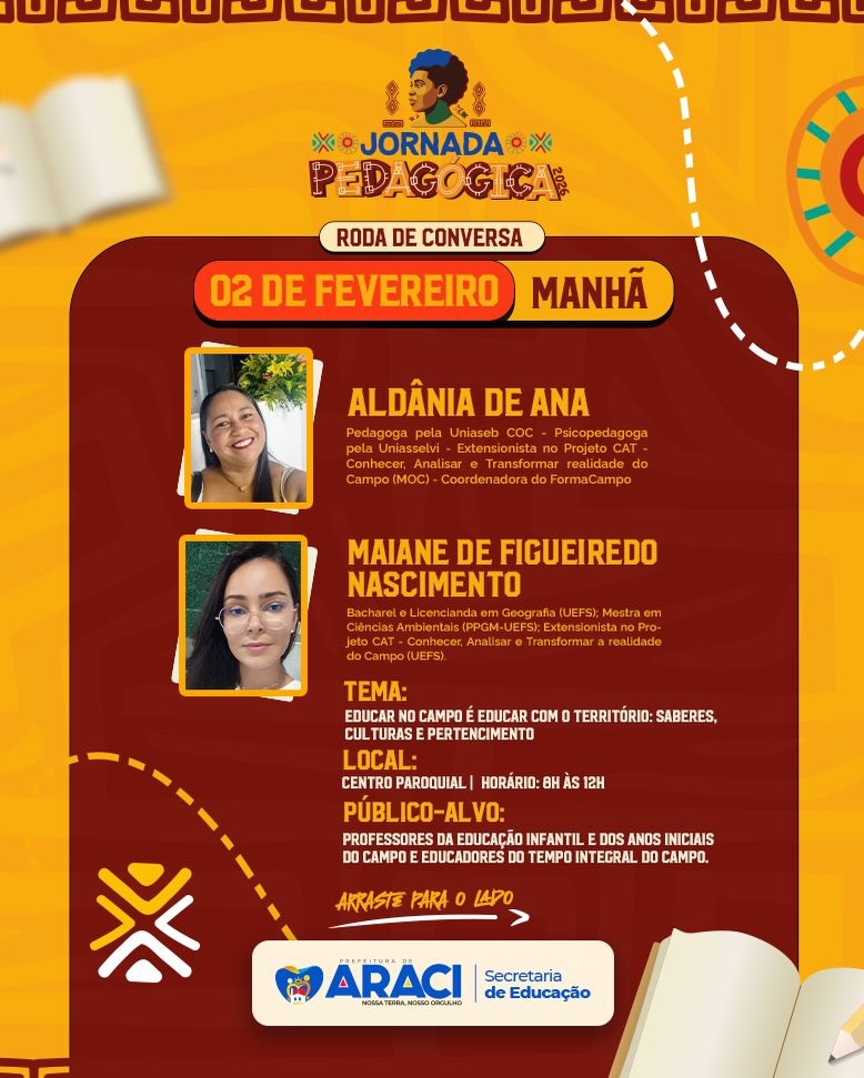 No dia 3 de fevereiro, as ações continuam com foco na educação inclusiva, busca ativa escolar e alinhamentos pedagógicos nas unidades de ensino. Já no dia 4 de fevereiro, a Jornada será encerrada com uma programação especial: pela manhã, as crianças da educação infantil participam do show teatral “A Arte de Contar Histórias”, com a personagem Joaninha Gigi; e, à noite, acontece uma mesa-redonda no Araci Fest Hall, com a participação da doutora Bárbara Carine e debatedoras convidadas, aprofundando o tema central da Jornada.