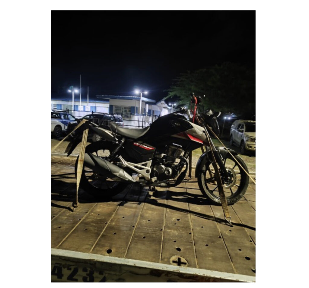 Após tomar conhecimento dos fatos, a guarnição realizou buscas no intuito de identificar os suspeitos. Depois de percorrer alguns km, já na proximidade da cidade de Araci, os PMs avistaram a motocicleta e emitiram ordem de parada, mas os indivíduos não acataram a orientação e adentraram numa região, com alta vegetação, abandonando o veículo.