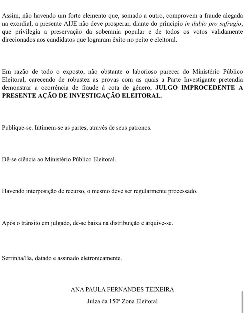 A juíza Ana Paula Fernandes Teixeira, da 150ª Zona Eleitoral de Serrinha, julgou improcedente a Ação de Investigação Judicial Eleitoral (AIJE) movida pela Federação Brasil da Esperança (PT/PCdoB/PV) e outros vereadores de situação, contra os partidos Avante e União Brasil de Barrocas e diversos candidatos que são de oposição, que eram acusados de fraude à cota de gênero nas eleições municipais.