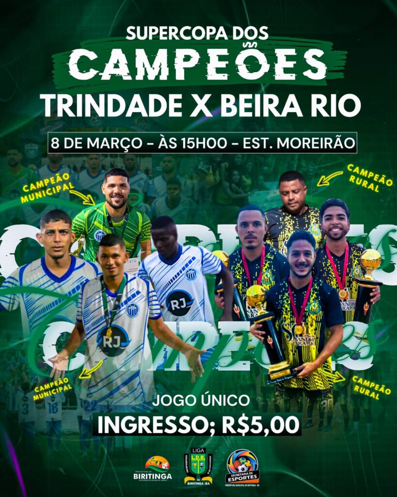 No dia 8 de março, acontece a Supercopa de Biritinga, reunindo o Campeão Rural Beira Rio e o Campeão Municipal 2025, Trindade. Já o Campeonato Municipal 2026 será disputado entre 11 de março e 23 de abril, com previsão de 12 equipes na briga pelo título: Beira Rio, Trindade, Pontal, União, Quipé, Perna Mole, Barro Branco, Barro Preto, Pau do Ôco, Vira Mão, Taboa e Zuador.