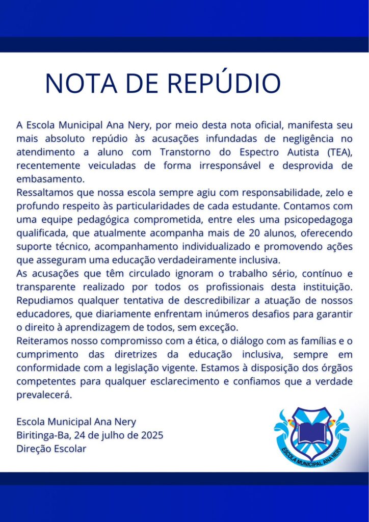Uma denúncia feita por uma mãe nas redes sociais gerou repercussão e levou a Escola Municipal Ana Nery, localizada na comunidade de Campo da Ema, em Biritinga, região sisaleira da Bahia, a publicar uma nota oficial de repúdio. No vídeo divulgado na tarde desta quinta-feira (24), a mãe de uma criança com Transtorno do Espectro Autista (TEA) e Transtorno Opositivo Desafiador (TOD) relata ter sido desrespeitada pela direção da unidade escolar ao solicitar um documento para acompanhamento médico do filho.
