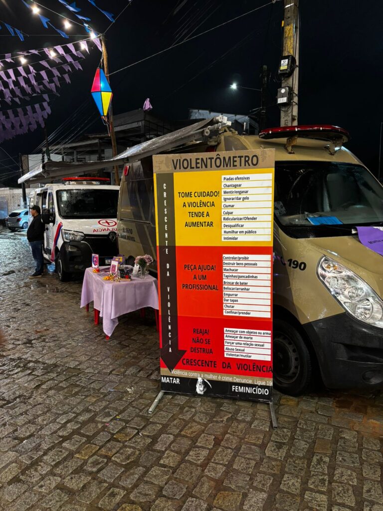 No local, o público tem acesso a tatuagens temáticas, ventarolas, folders informativos e a um “violentrômetro” — instrumento que ajuda a identificar os níveis de violência enfrentados por mulheres, destacando a escalada que pode culminar no feminicídio.