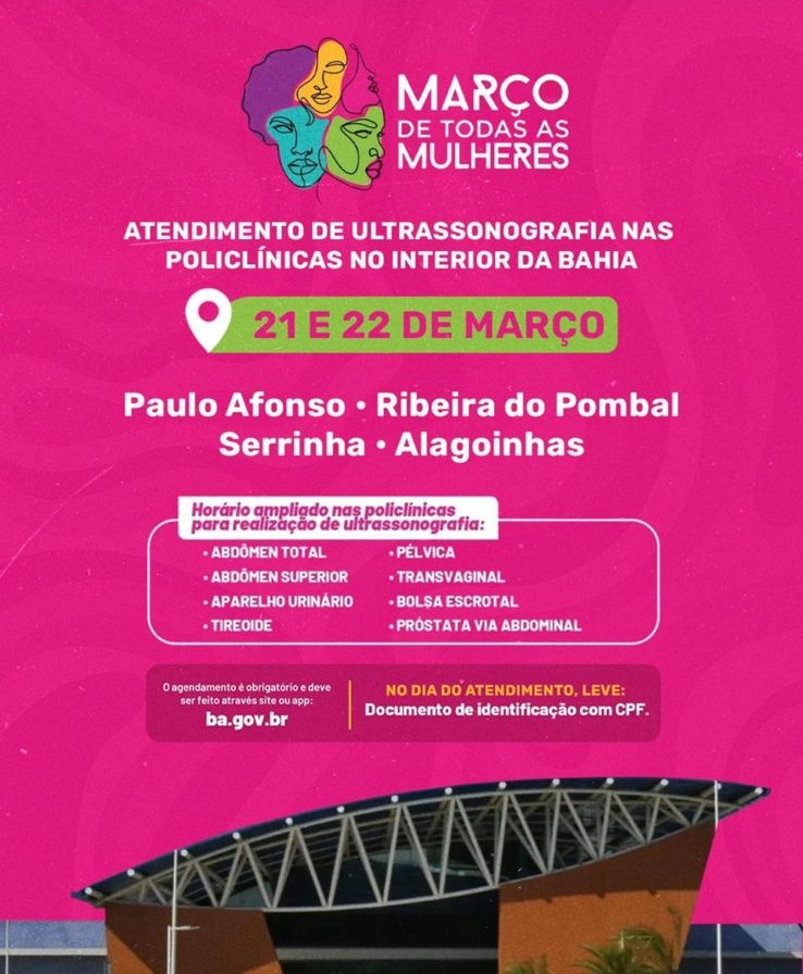 Coordenada pela Secretaria da Saúde do Estado da Bahia (Sesab), a ação inclui consultas médicas, exames, vacinação, testagem rápida e atividades de prevenção em diversas regiões do estado. Na região sisaleira, o destaque será o atendimento na policlínica regional, no município de Serrinha, onde os serviços ocorrerão nos dias 21 e 22 de março.