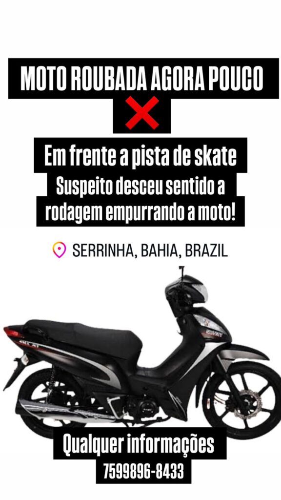 O crime ocorreu poucos minutos antes da divulgação do alerta, que circula nas redes sociais com a imagem da moto e um número de telefone para informações que possam ajudar na localização.
