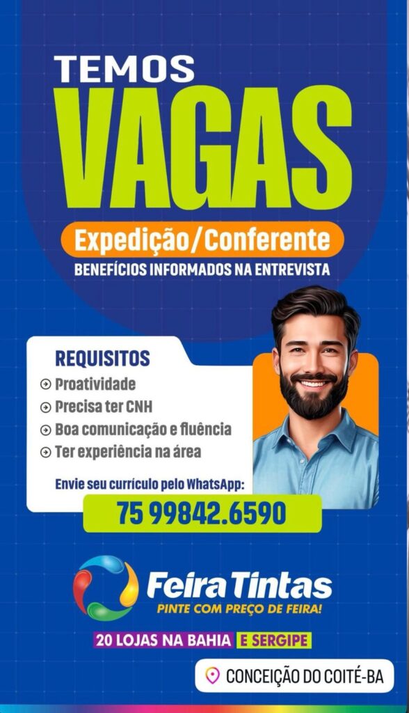 A empresa Feira Tintas, com unidade em Conceição do Coité, está com vaga aberta para Expedição/Conferente.