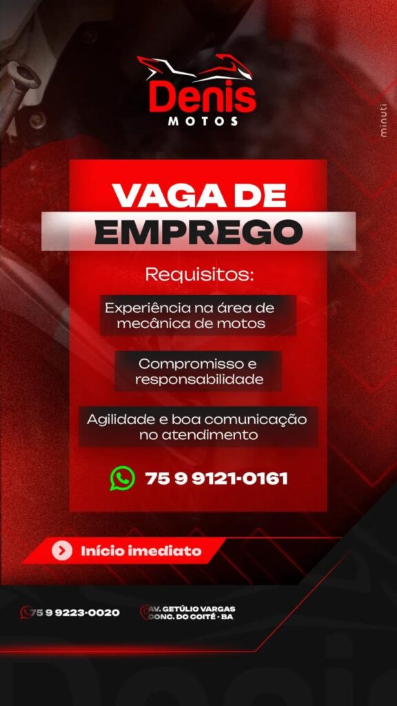 A empresa Denis Motos, localizada na Avenida Getúlio Vargas, em Conceição do Coité, está com vaga aberta para profissional com experiência na área de mecânica de motocicletas.