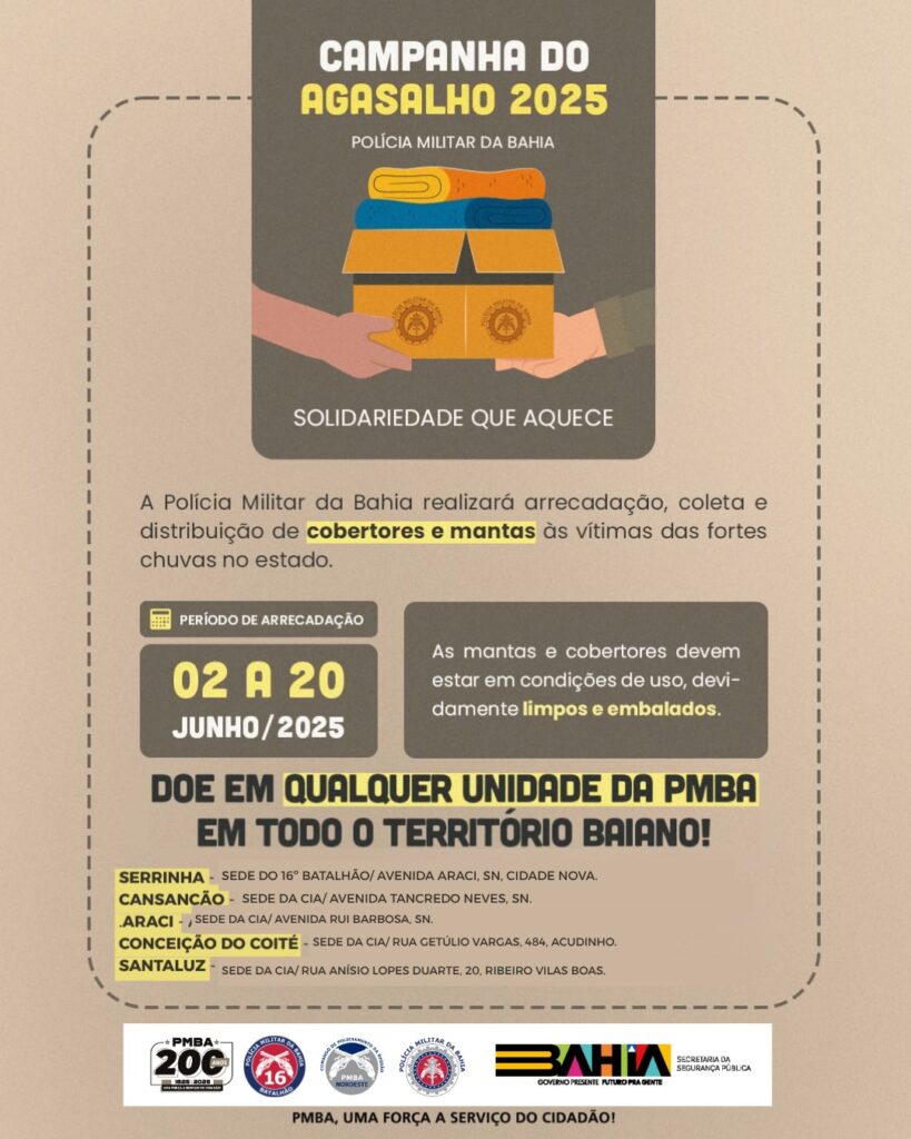 O Comando do 16° BPM/Serrinha convida a população residente nos 18 municípios sob sua responsabilidade a participar da campanha, informando que reservou cinco locais para a coleta das doações: