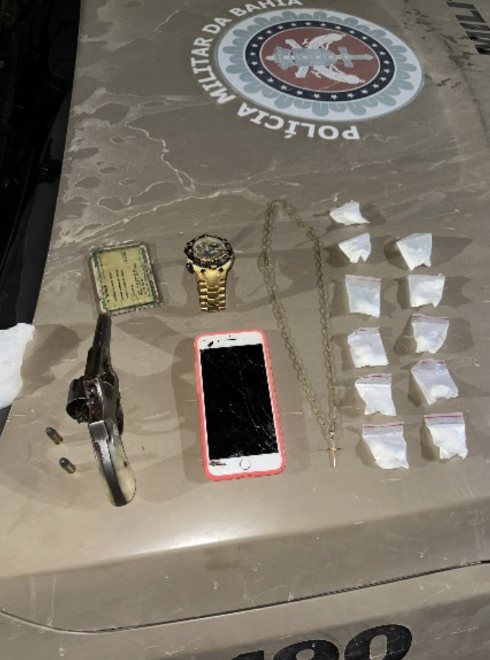 Durante a busca pessoal, foi encontrado em sua cintura um revólver calibre .32 e, em seu bolso, uma quantidade de substância análoga à cocaína.