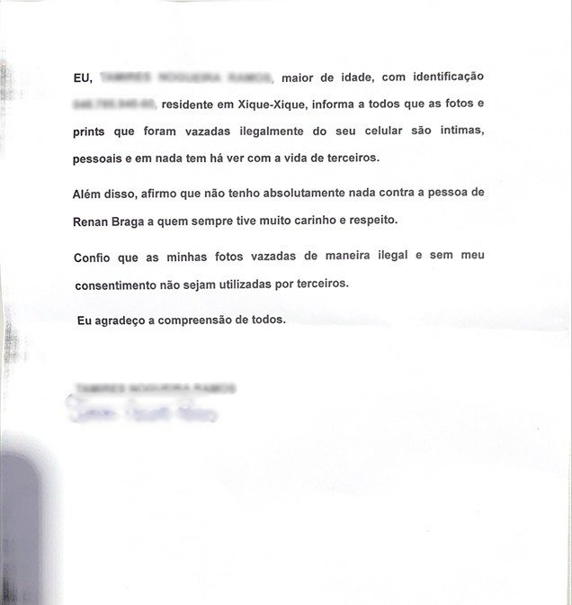 A assessoria do administrador divulgou uma nota em que a própria vitima teria se manifestado contra a divulgação de fotos íntimas dela e afirmado não ter nada contra “a pessoa de Renan Braga”. O fato foi registrado nesta quarta-feira (15) na delegacia da cidade