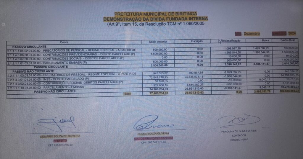 O próprio prefeito Gilmário assinou o demonstrativo da Dívida Fundada Interna do município de Biritinga, enviado ao Tribunal de Contas dos Municípios (TCM), revelando que o total das dívidas ultrapassou a marca de R$ 100 milhões em 2024. O documento oficial, que traz a assinatura do prefeito e dos responsáveis pela contabilidade e finanças, demonstra um cenário preocupante: o passivo não circulante e circulante juntos somam mais de R$ 100,8 milhões, evidenciando um comprometimento severo das finanças municipais.