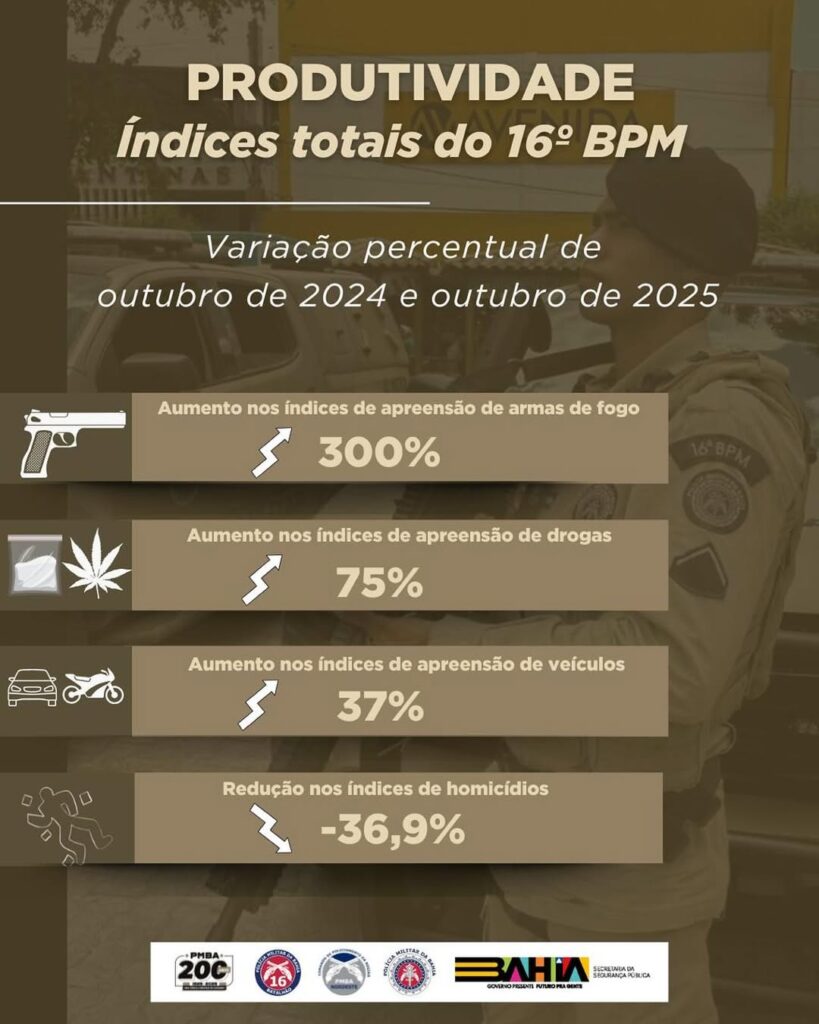 Esses números refletem o profissionalismo e a dedicação dos policiais militares que compõem o 16º BPM, sob o lema #PMBANASRUAS e #BahiaSegura.
