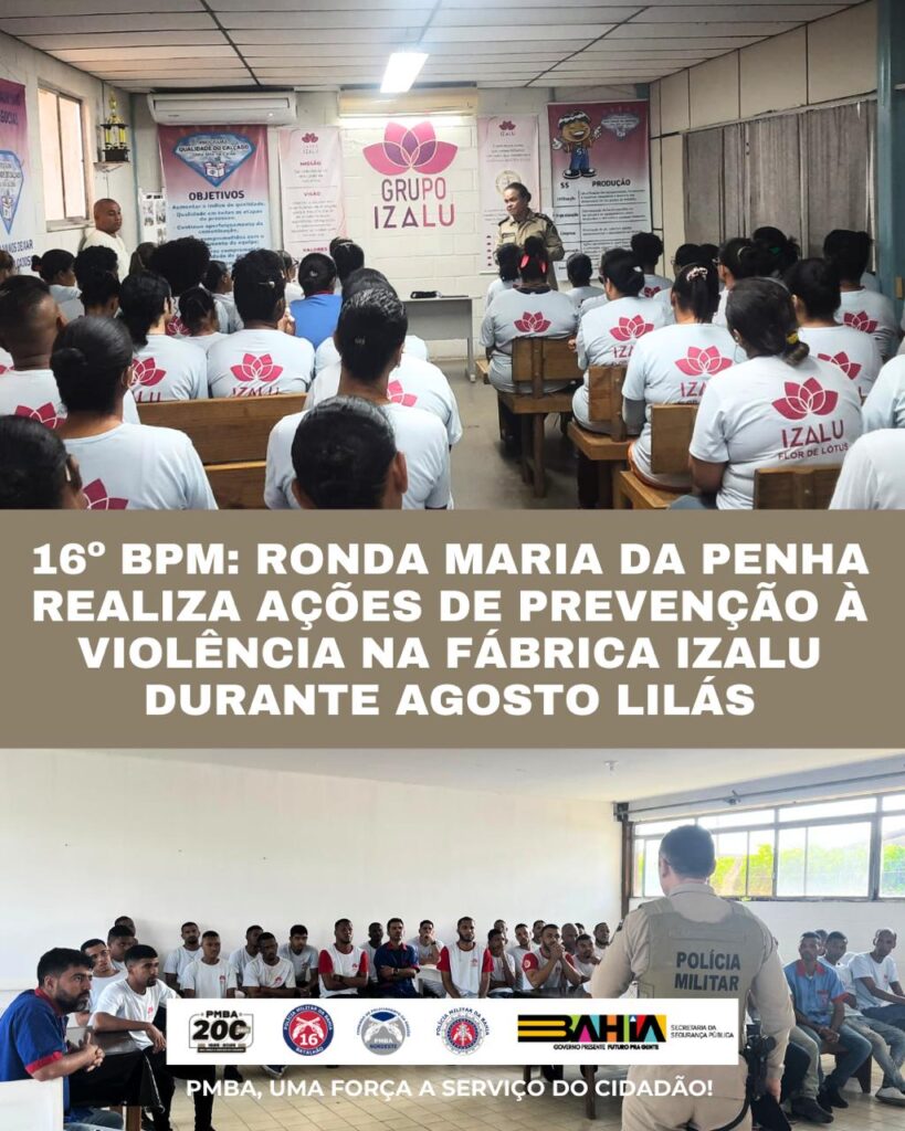 O 16º Batalhão de Polícia Militar, através da Ronda Maria da Penha (RMP) da Região Sisaleira, realizou também, entre os dias 5 e 15 de agosto, uma série de ações de conscientização e prevenção à violência doméstica, familiar e de gênero na Fábrica Izalu, em Serrinha, como parte da campanha Agosto Lilás.