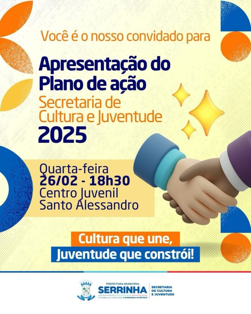 Na próxima quarta-feira, 26/02, a partir das 18h30, no Centro Juvenil Santo Alessandro, a Secretaria Municipal de Cultura e Juventude de Serrinha, apresentará o Plano de Ação com projetos e ações que irão fortalecer a cultura local e criarão novas oportunidades para a juventude serrinhense.
