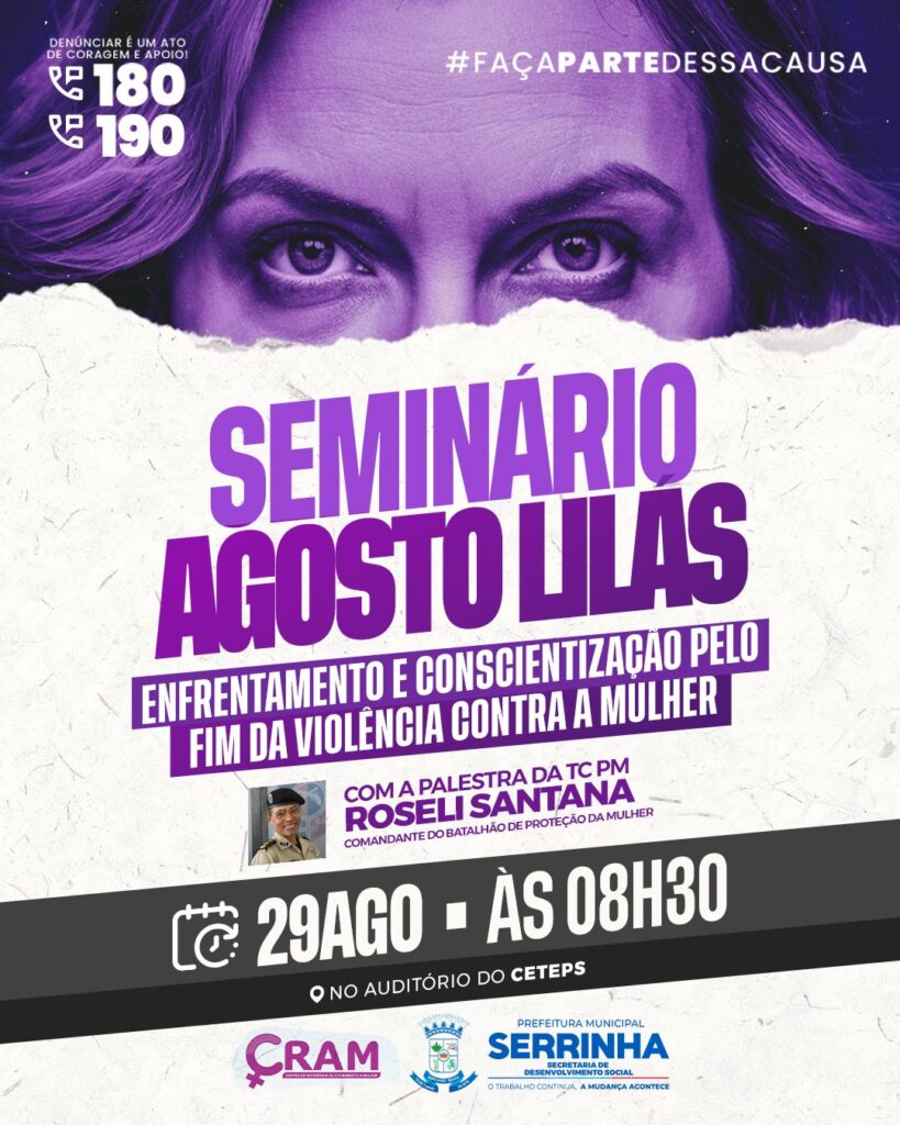No mês de agosto, em que todo o país se une em torno da campanha Agosto Lilás, Serrinha dá um passo firme na luta pelo fim da violência contra a mulher. A cidade sediará, nesta sexta-feira (29/08), o Seminário Agosto Lilás, com o objetivo de promover enfrentamento, conscientização e prevenção contra todas as formas de violência que atingem mulheres diariamente.