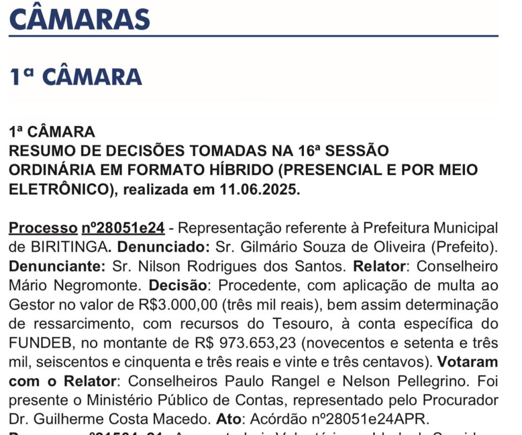 Em uma decisão judicial que chegou em primeira mão a redação do Portal Massapê, o Tribunal de Contas dos Municípios da Bahia (TCM-BA) julgou procedente a denúncia contra o prefeito de Biritinga, Gilmário Souza de Oliveira (Gil de Gode), apresentada pelo vereador Nilson Rodrigues dos Santos, e determinou a devolução de R$ 973.653,23 aos cofres públicos. A decisão foi tomada na 16ª Sessão Ordinária da 1ª Câmara, realizada no dia 11 de junho de 2025, em formato híbrido.